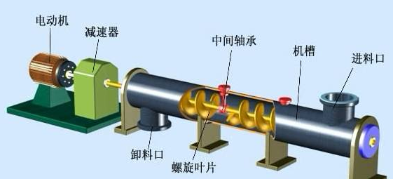 螺旋輸送機的工作原理是旋轉的螺旋葉片將物料推移而進行輸送,使物料不與螺旋葉片一起旋轉的力是物料自身重量和螺旋葉片對物料的摩擦阻力。螺旋葉片的面型根據輸送物料的不同有實體面型、帶式面型、葉片面型等型式。螺旋軸在物料運動方向的終端設有止推軸承以隨物料給螺旋的軸向反力,在設備機長較長時,應加中間吊掛軸承。